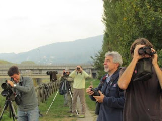 Non siamo gli unici armati di specola e binocolo (e digitale): c’è anche qualche autoctono, tra i quali Alberto Artiglia, già incontrato altre volte. Debordando in un moto di campanilismo, forse sopra le righe, osservo che il nostro gruppo li supera numericamente. Ci metto anche piccolo vezzo narcisistico, visto che a muovere il tutto sono stato io. Va beh, tiremm innanz. Il Piero lancia un brindisi, alla vigilia del suo compleanno, mentre non manca di chiosare sull’inconsueta presenza del Pepp Redaelli, che ha lasciato Brivio e il Meratese: una volta tanto… Inscì vegan cuma il Reda: se la penisola fosse costellata di soggetti che ne rilevano i vari angoli, avremmo a disposizione una messe di dati da favola. Considerazioni oziose. Ci tocca però levare le tende, tra timori di code in quel di Milano e i tentativi di Checco e Piero di trovare qualche altra perla nei dintorni. Spariscono i due, facendosi aspettare agli automezzi. Quando ci raggiungono, è un farneticare di piro piro rari. Meglio dar di motore, vah.