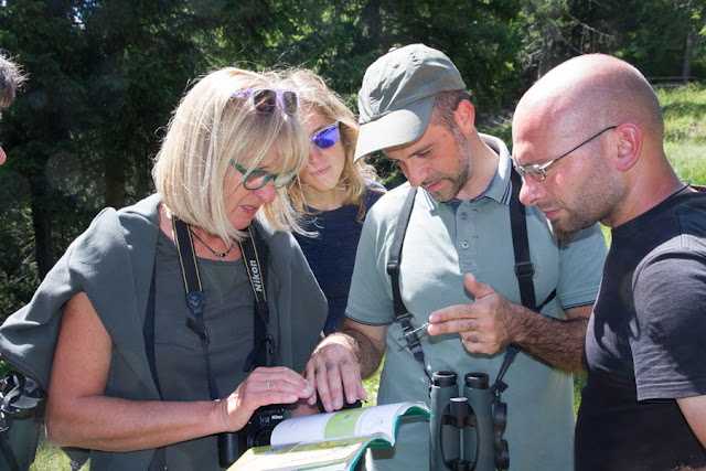 Oltre agli esperti di uccelli, nel gruppo vi sono esperti di rettili e di libellule; prendiamo il sentiero che ci conduce a un vasto prato umido, solcato da alcuni ruscelli e dove spicca la bellezza degli esili eriofori (Eriophorum angustifolium) dal caratteristico pennacchio bianco.
