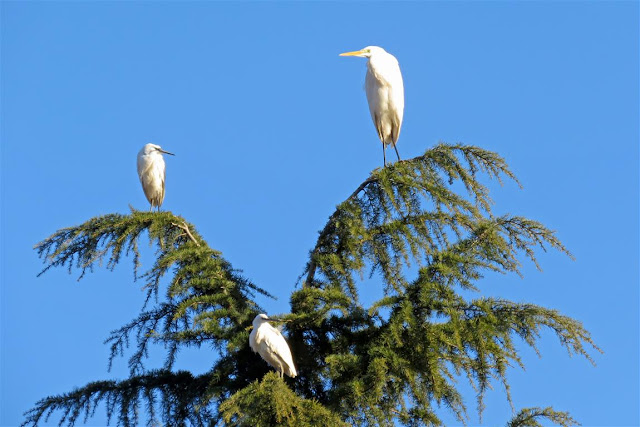 Colico (LC), insolito posatoio usato da un Airone bianco maggiore e due Garzette. Fotografia Marco Esposito