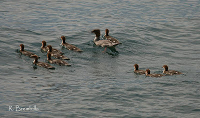 Sul catalogo del Dottor Erasmo Buzzi leggiamo: 11.Pescajola Mergus albellus: Da noi comunissima d’inverno. 12.Smergo minore Mergus serrator comunissimo d’inverno. 13.Smergo maggiore Mergus merganser più raro delle specie precedenti. Pur non essendo un lavoro scientifico, come da lui affermato, certamente sono dati che qualche elemento di verità hanno. Oggi le cose sono ben diverse: In Lombardia e precisamente Sul lago di Como lo Smergo maggiore ha la sua prima accertata nidificazione nel 2005 (vedi articolo all’indirizzo http://www.cisniar.it/picus_n°_62.htm) nel 2006 in alto lago, precisamente presso Piona (Lc) di Smergo mag. ne sono stati individuati 16, (vedi http://crosvarenna.blogspot.com/ – Annuario 2006). Nel 2007 sul Lago di Como sono state segnalate 3 nidificazioni di Smergo maggiore in particolare: a Varenna (LC) 10 anatroccoli, a Oliveto Lario (LC) 8 e 7 anatroccoli osservati presso Lezzeno (Lc) di cui però non si sa l’esatta località di nidificazione. Vedremo come si evolverà la presenza di questi uccelli sul nostro lago, oggi godiamoci l’osservazione di questa splendida anatra.