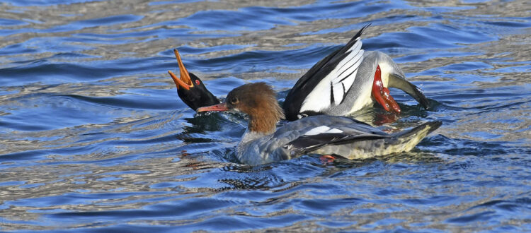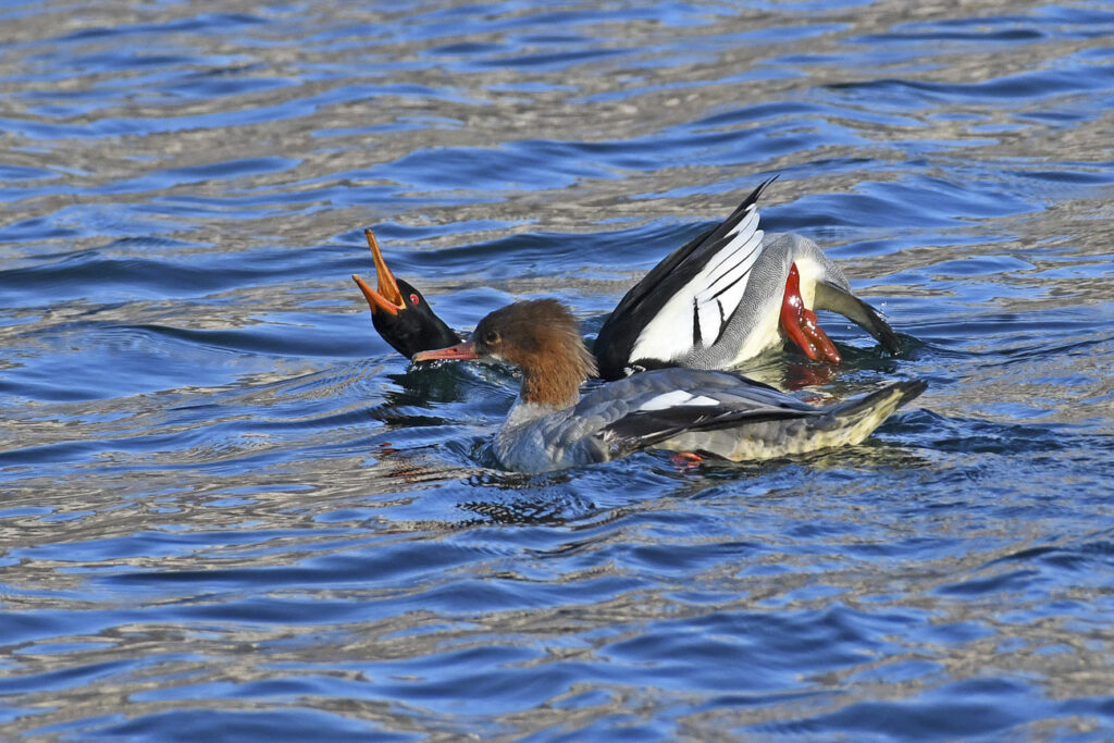 Lago di Olginate (LC) — Curioso e insolito episodio di parata nuziale: un maschio di smergo minore esibisce il suo corteggiamento nei confronti di una femmina di smergo maggiore, dando vita a una scena tanto elegante quanto singolare.